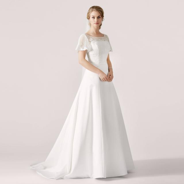 Satin A-line weddingdress with a floral lace embellished bodice. Backlace and a small train