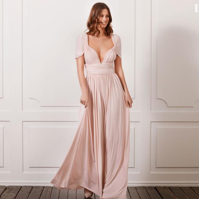 Lilly's classic infinity dress, allows each bridesmaids to style (or wrap) herself in a unique look (and size), while at the same time blending into the coordinated look of all the bridesmaids. Choose the same colour for all bridesmaids or pick a colour flow from darker to lighter shades.