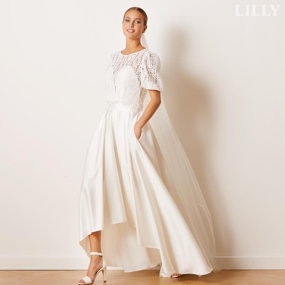 Suknie ślubne LILLY dla ciężarnych panien młodych zachwycają finezyjnymi krojami i miękkimi materiałami. Nic więc nie stoi na przeszkodzie, aby panna młoda z brzuszkiem pojawiła się w urzędzie stanu cywilnego lub kościele w niezwykle atrakcyjnej kreacji.