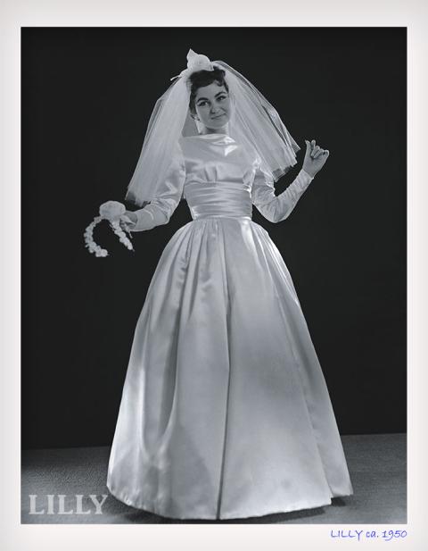 In the beginning, Lilly recreated ladies' wardrobes, e.g. suits, dresses or jackets. She was not only a gifted businesswoman but also an incomparable design talent with a lot of craftsmanship and a great love for details. One of the first customers who entered, was a young lady and her mother, who placed an order for a wedding dress, to be made out of an english silk parachute that they had saved. This became the starting shot for LILLY's success story: for those who wanted to wear a new weddingdress in the post-war period - a time when clothing and fabrics were very rare and precious - it was important to find a company, that could accomplish the miracle of making five-meters of fabric look like 30! Word quickly spread, and during the next ten years brides from all over Denmark came to Vejle to have their weddingdress made by Lilly. And soon she concentrated entirely on bridal and evening wear as the core business of the newborn "LILLY" brand.