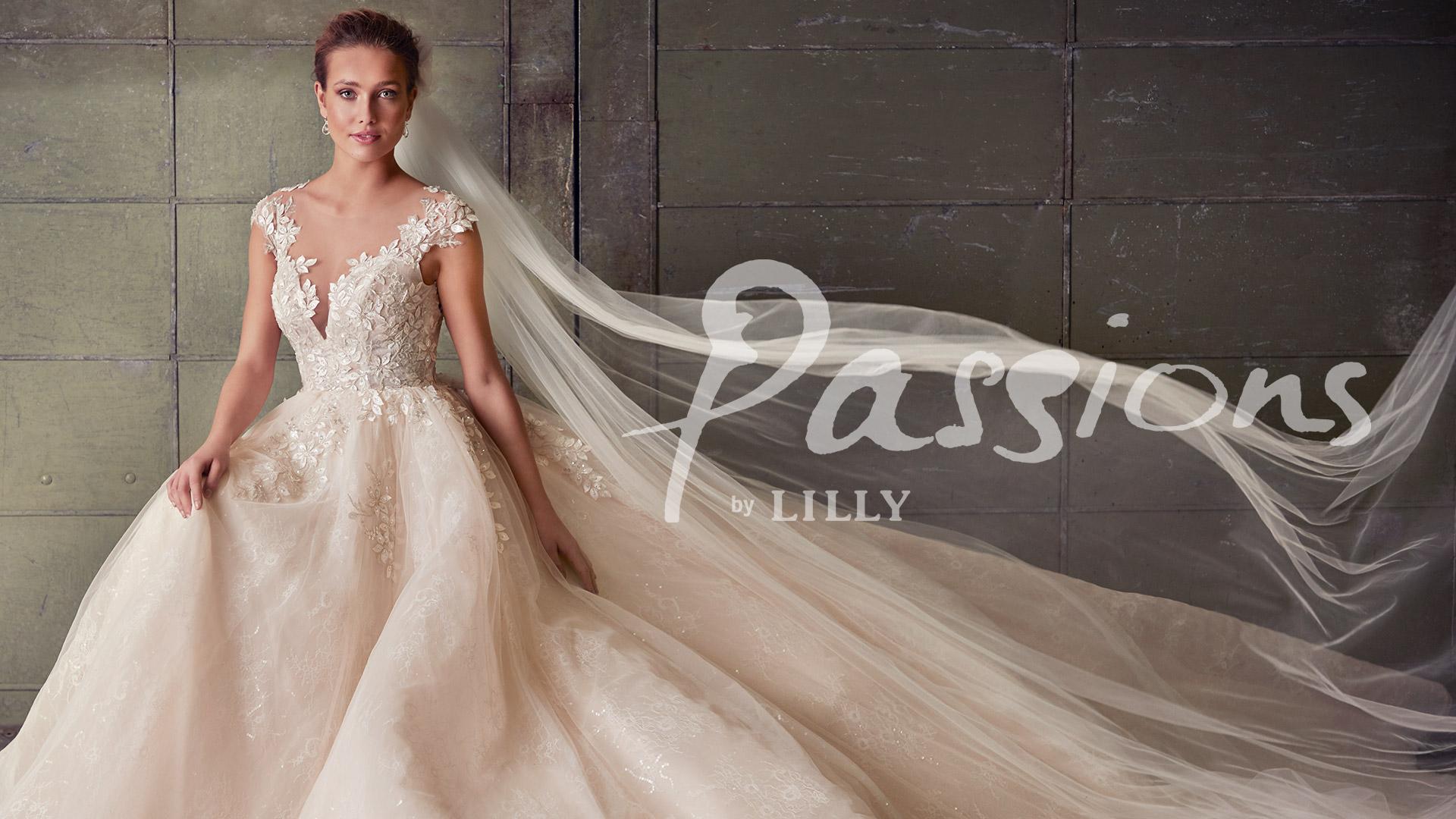 The collection PASSIONS by LILLY focuses on exquisite princess wedding dresses with lush skirts and richly embroidered details in 3D. The large skirts in the 'Ballgown' cut float easily around the bride and the impressive bridal trains emphasizes the graceful bridal look.